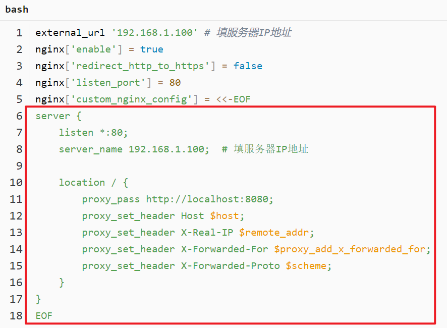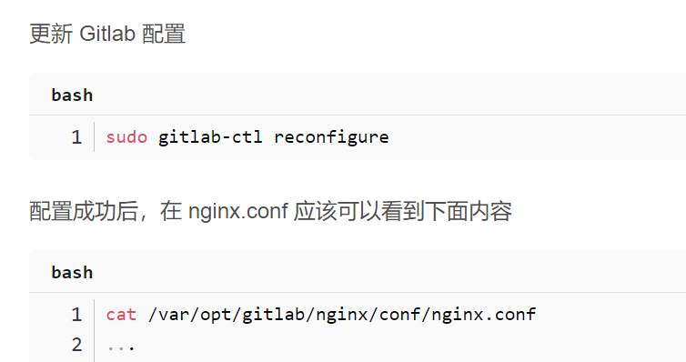 首先,如果做完这个 server 块的配置,按照如下步骤,查看 /var/opt/gitlab/nginx/conf/nginx.conf 生成文件,应该可以看到 server 块在最下方