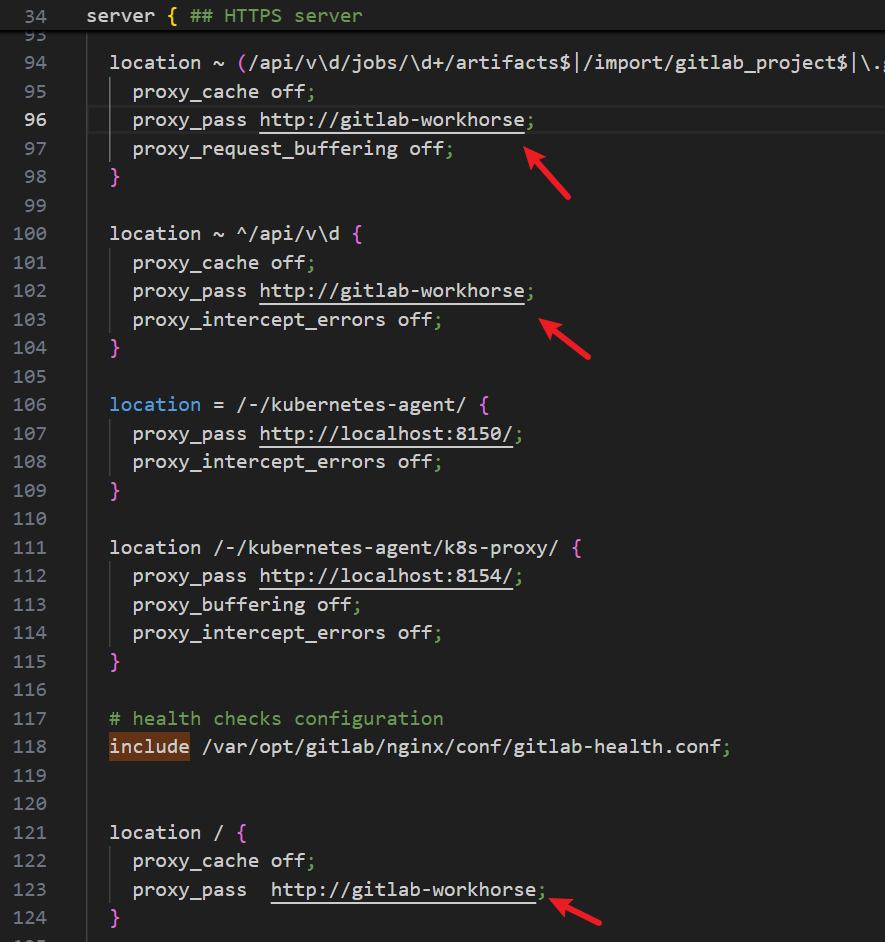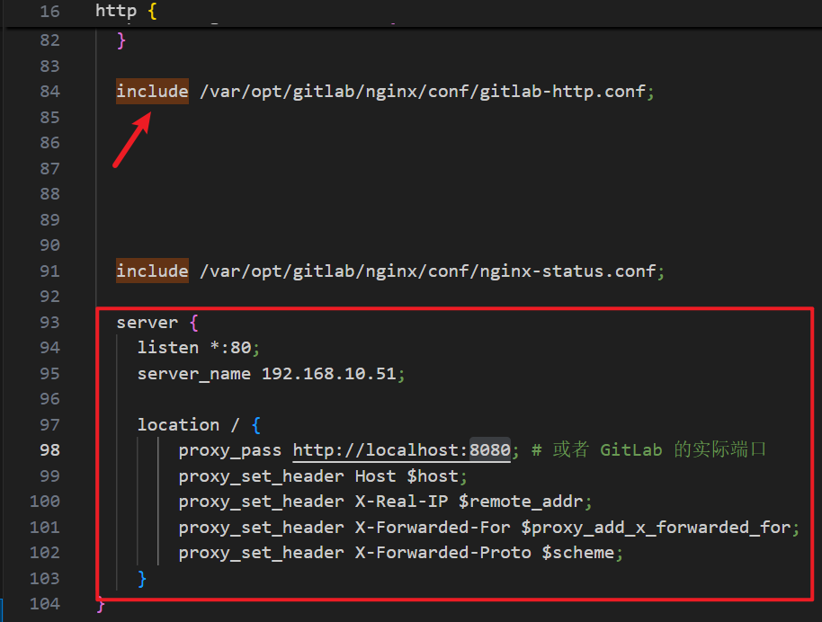 但是需要注意的是,在 84 行,有个 Gitlab 默认的 server 配置块 var/opt/gitlab/nginx/conf/gitlab-http.conf,查看该文件内容,可以发现里面的 server 块指向的是 Gitlab-Workhorse