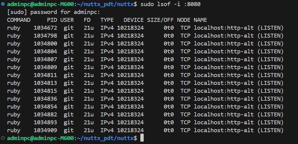 查看谁在监听 8080 端口,可以看到,正是 Puma 服务在监听使用 8080 端口