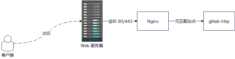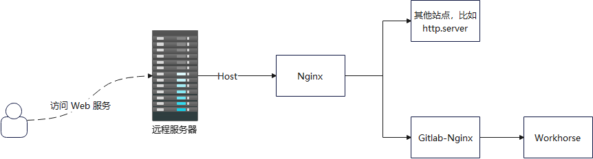 可以看到有两个 Nginx 在工作,其中一个是 /usr/sbin/nginx,就是之前 blog 手动安装的那个,另一个 Nginx 是 /var/opt/gitlab/nginx,这个就是 Gitlab 自带的 Nginx,所以如果只搭建 Gitlab 服务的话,用 Gitlab 自带 Nginx 就够了,当然,不是说手动安装的那个 Nginx 就没用了,如果想启用二级代理(同一个机器支持多个站点)的话,手动安装的 Nginx 也是有用的,使用场景如下