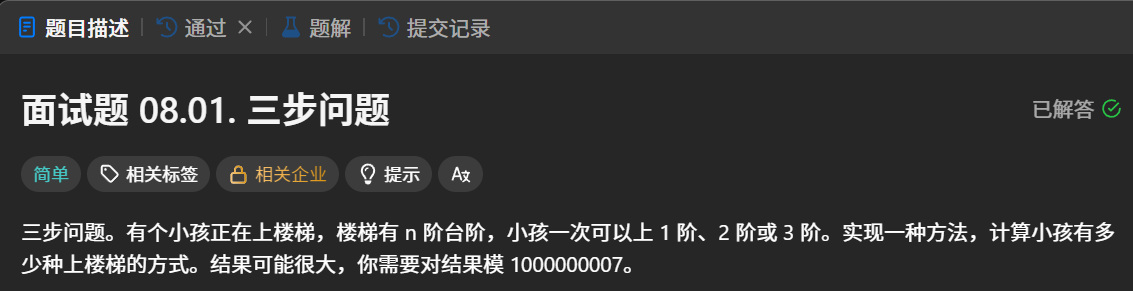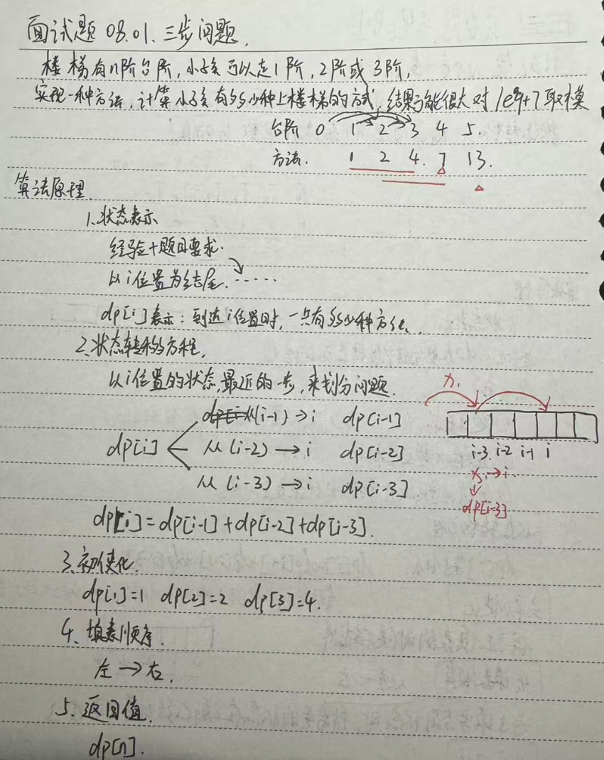- 上一步上三级台阶:dp[i] += dp[i-3];