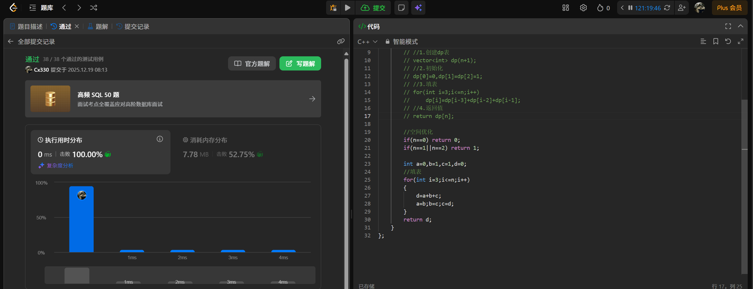 - 上一步上两级台阶:dp[i] += dp[i-2];