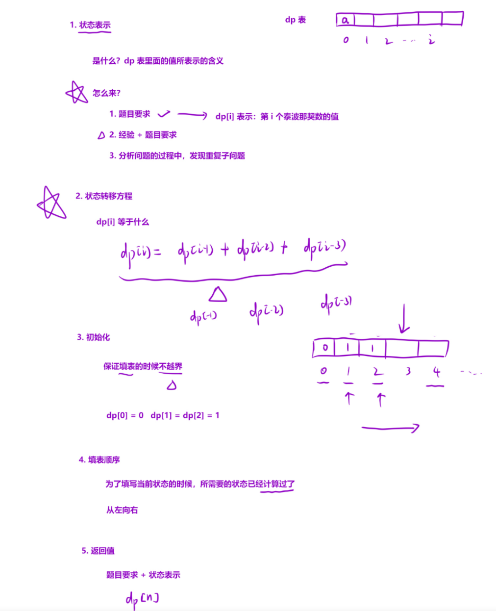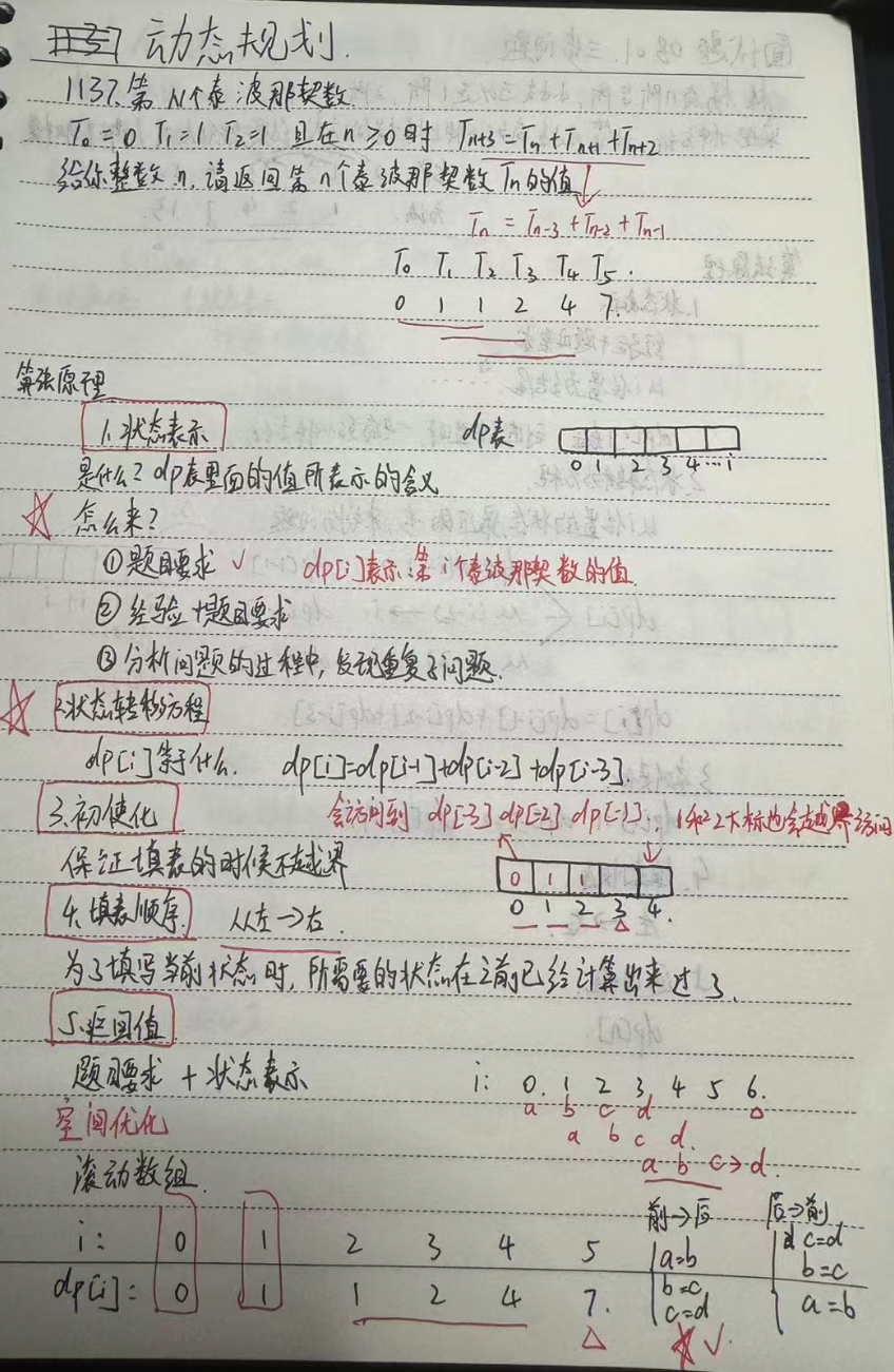 总结:本文分享了两个动态规划算法题的解题思路与代码实现。第一个是第N个泰波拉契数问题,通过状态转移方程dp[i]=dp[i-1]+dp[i-2]+dp[i-3]求解,并给出了空间优化方案。第二个是三步问题,分析上台阶的不同方式得出状态转移方程dp[i]=dp[i-1]+dp[i-2]+dp[i-3],强调取模运算的重要性。两题都采用从左往右填表顺序,并提供C++实现代码及空间优化版本