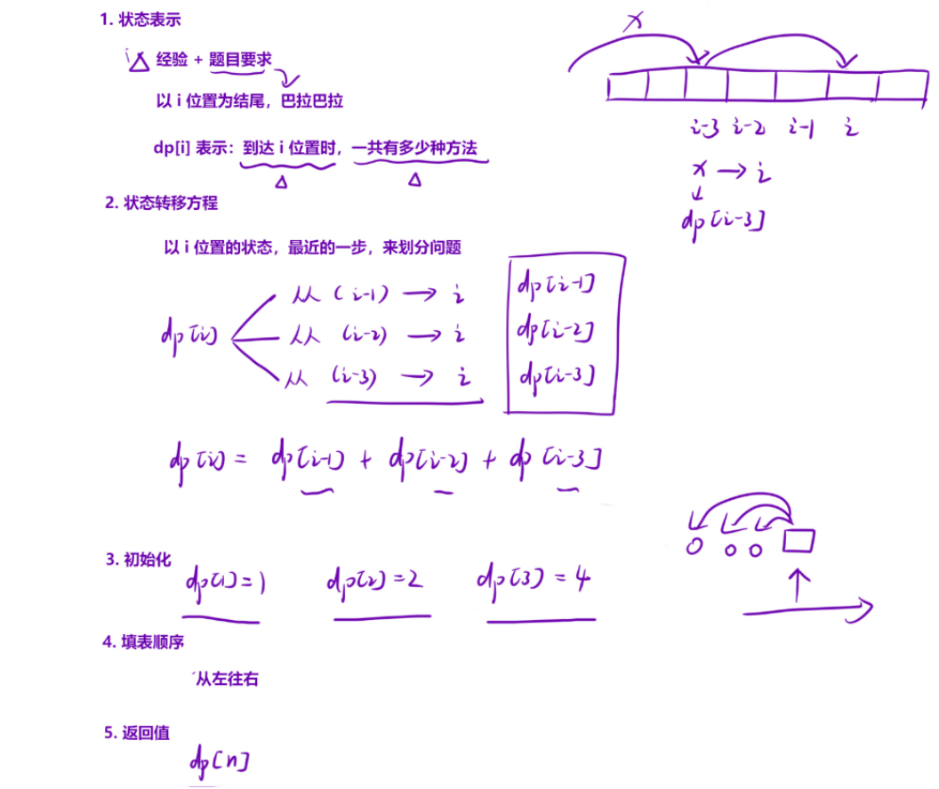 dp[i]表示:到达i 位置时,一共有多少种方法。