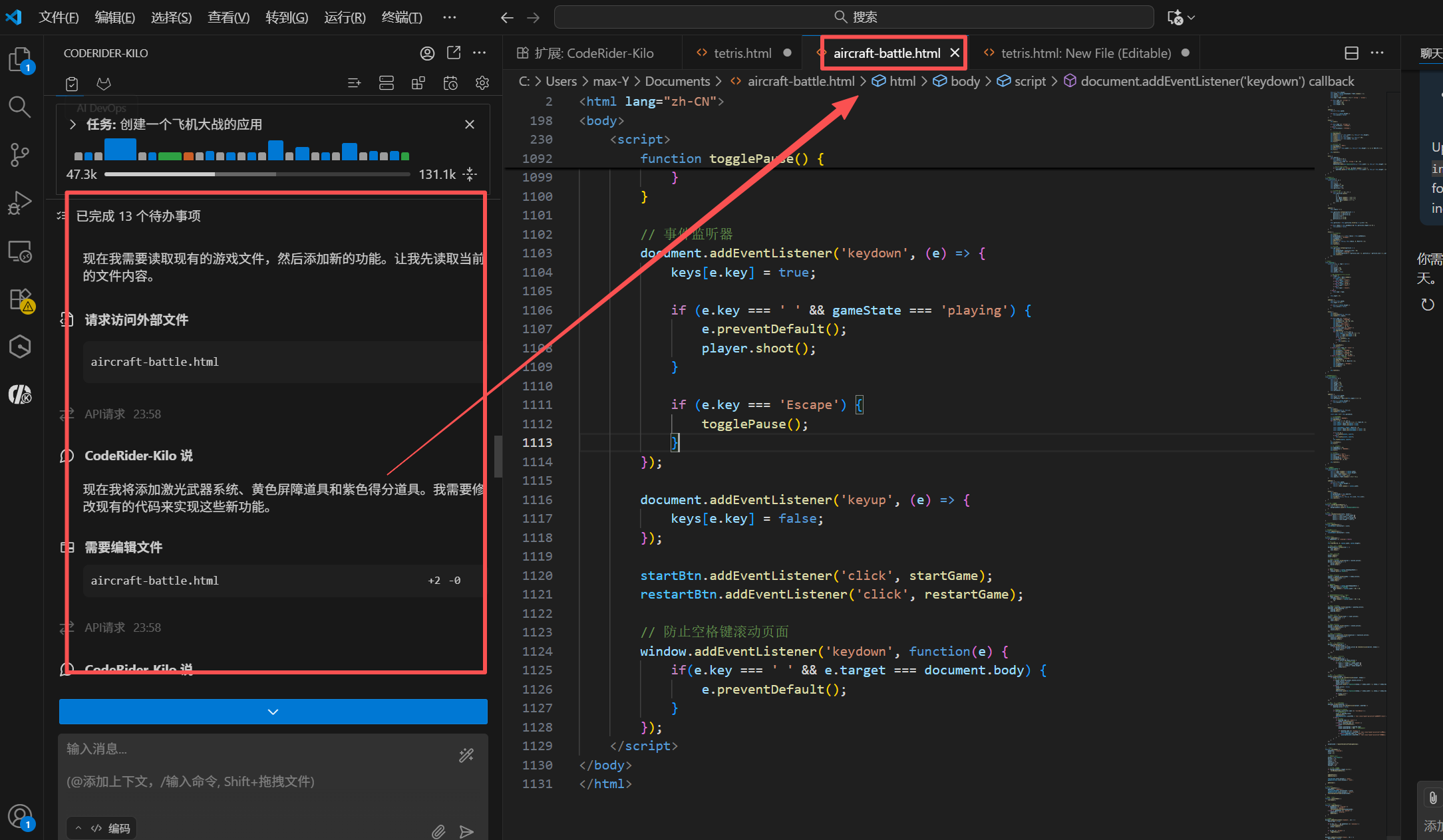直接告诉CodeRider-Kilo AI助手"我想要一个飞机大战的网页小游戏"