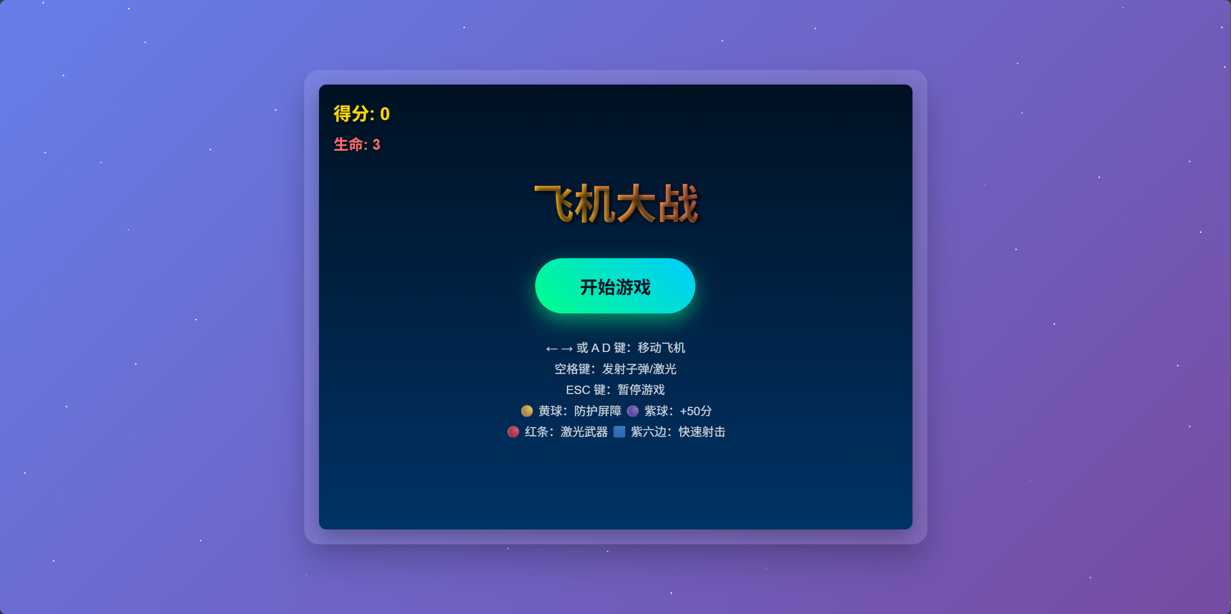 - 键盘事件:监听方向键(←→)、A/D 键控制飞机移动,空格键发射子弹,ESC 键暂停游戏。