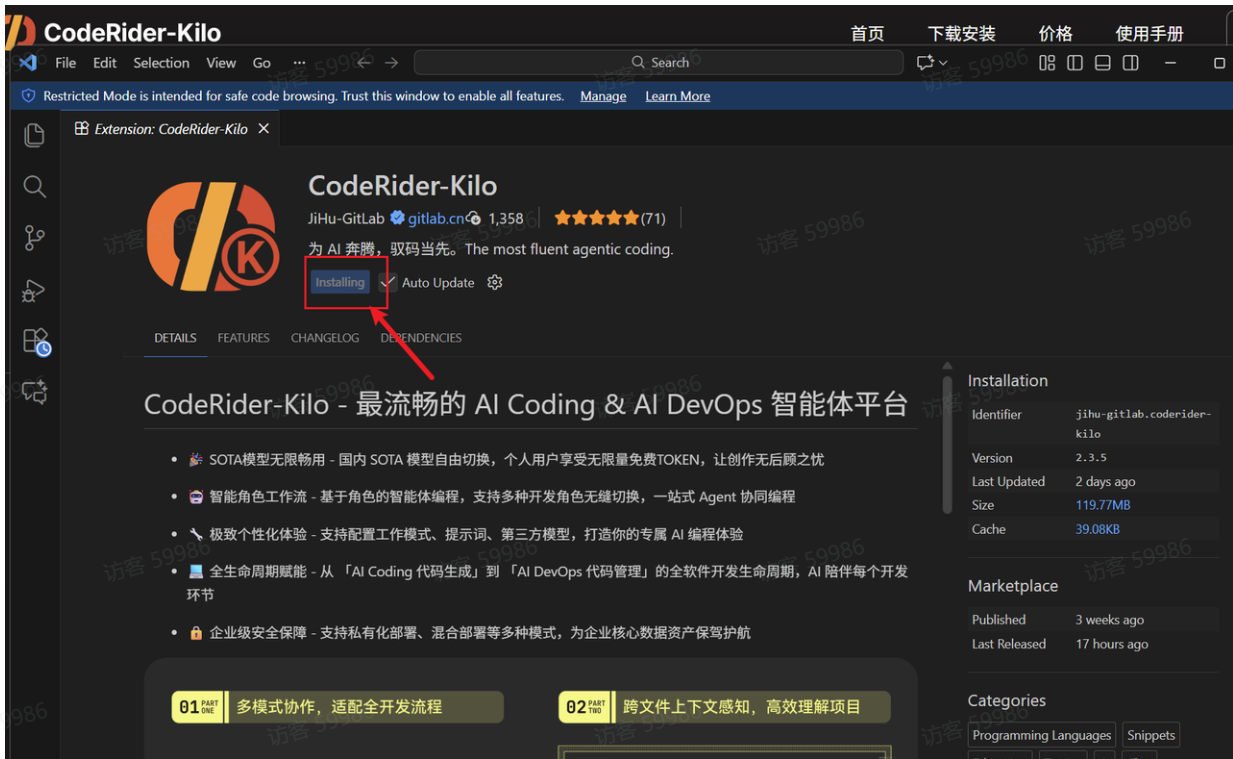 极狐CodeRider-Kilo是安装步骤非常简便的AI助手之一,这是让我非常惊喜的一点,并且非常轻量化