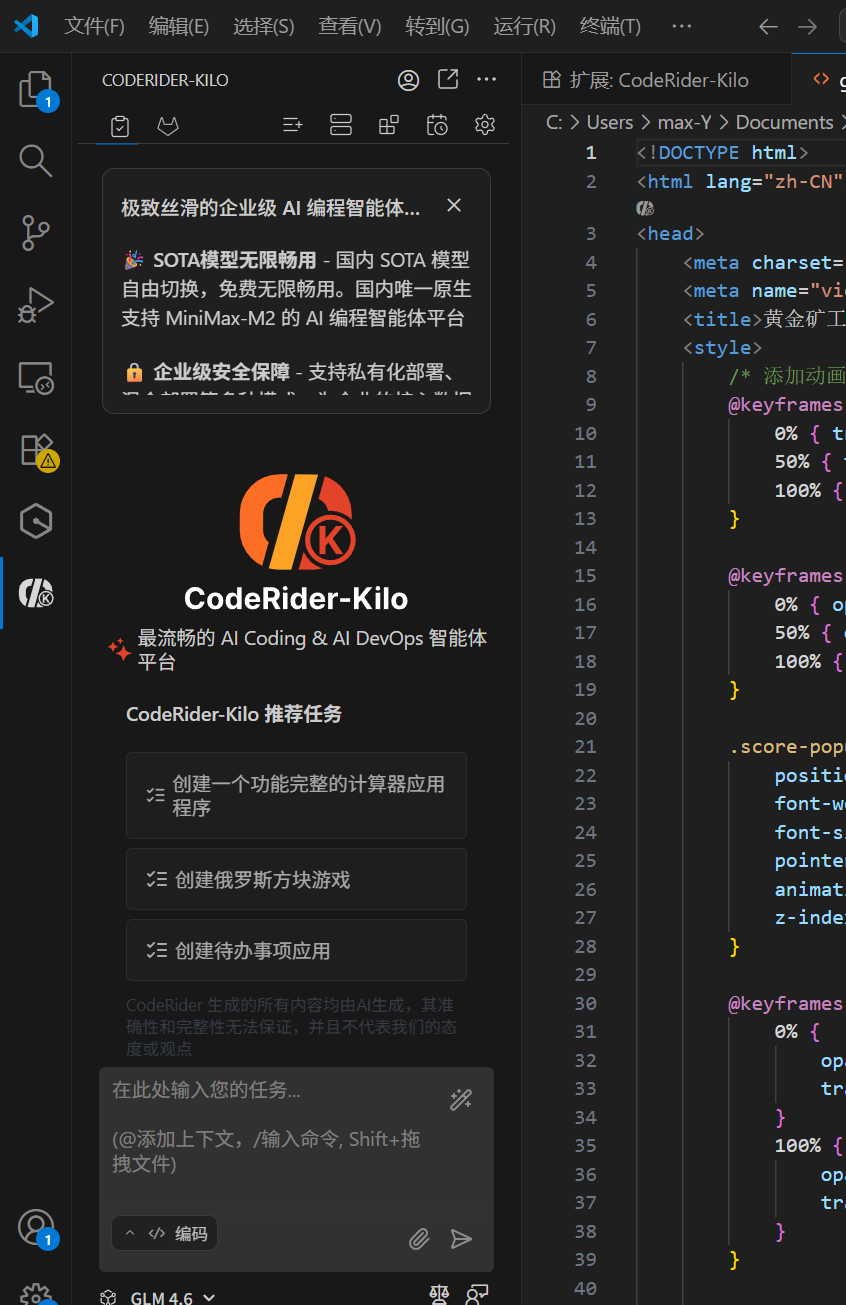 登录之后就会有自己的体验界面了,这就是CodeRider-Kilo的界面