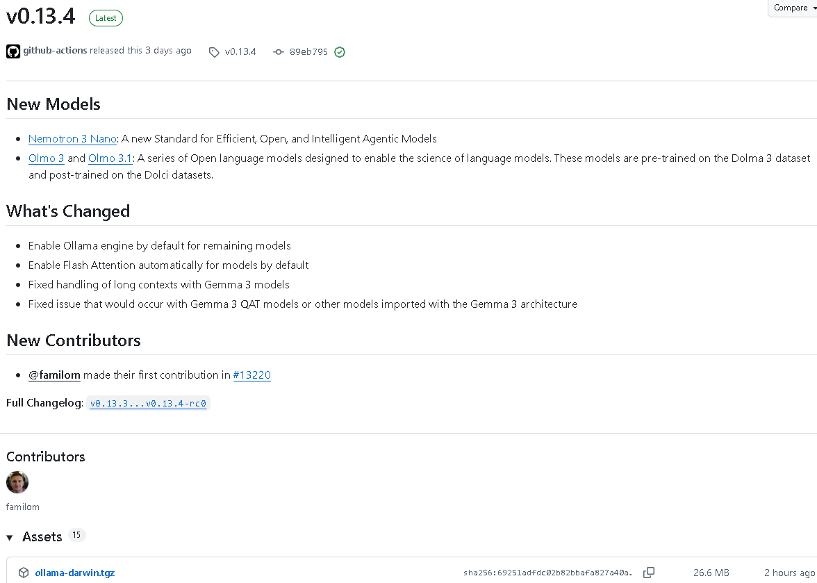 2025年12月13日,ollama v0.13.4版本预发布,随后于2025年12月16日正式发布。本次更新是一次重要的版本迭代,包含新模型的推出、引擎默认设置的调整、Flash Attention机制的自动化启用,以及一系列对Gemma 3架构模型的修复与增强。以下是详细更新内容。