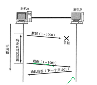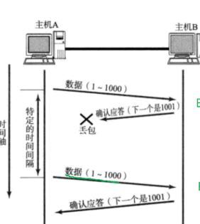 由于A在发的过程中丢包了,但是他不知道自己丢了,所以在等待到一定的时候后,就会触发超时重传,再给B传输这个数据。