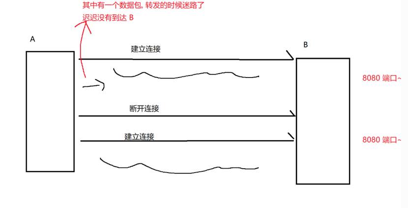 A给B传输消息的时候,约定好使用8080端口,初始序号是1000,如果这个时候其中有个数据包迟迟没有传输到B,甚至等到这次连接结束都没到,那么下次建立连接,约定好使用8080端口,初始序号是2000,这个时候之前迷路的数据包到啦,那咋办,丢弃掉,因为初始序号都不一样,指定是叛徒,丢了就行
