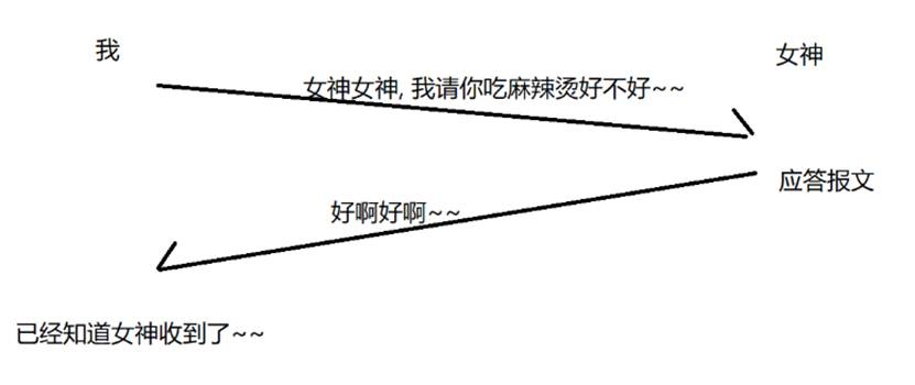 我给女神发消息,问女生吃不吃,这个时候女神这边就需要给我回应,让我知道他有没有收到这个信息,这个返回就叫做ACK