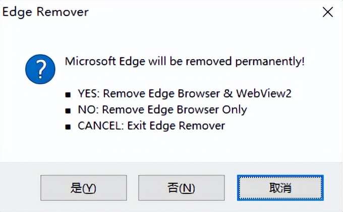 点击「是」:同时移除Edge浏览器+WebView2运行时(适合完全不用Edge、想彻底清理的用户);