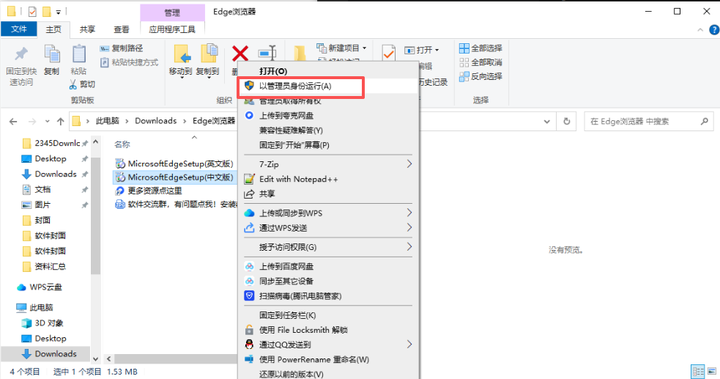 3.鼠标右击「Edge.exe(中文版或者英文版)」选择【以管理员身份运行】,如果不想用,直接删除整个文件夹即可。