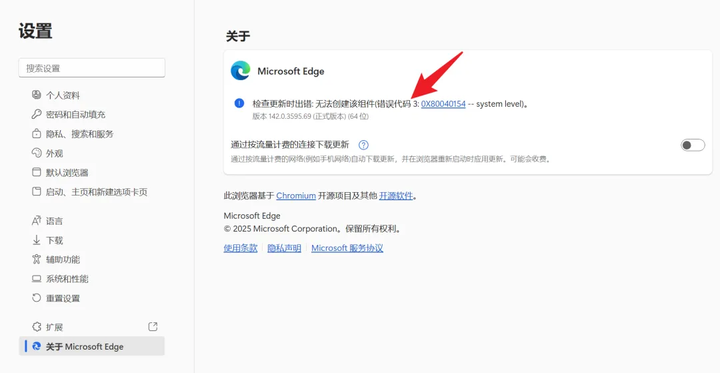 再回到Edge里,可以看到Edge已经提示"检查更新时出错"了,这样Edge就无法更新了!