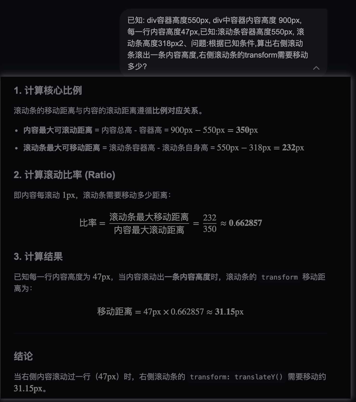 // 滚动条最大可移动距离 = 容器高度 - 滚动条高度 = 差值( n )/ 滚动条滚动的距离 ( n1 ) = 比例 ( X )