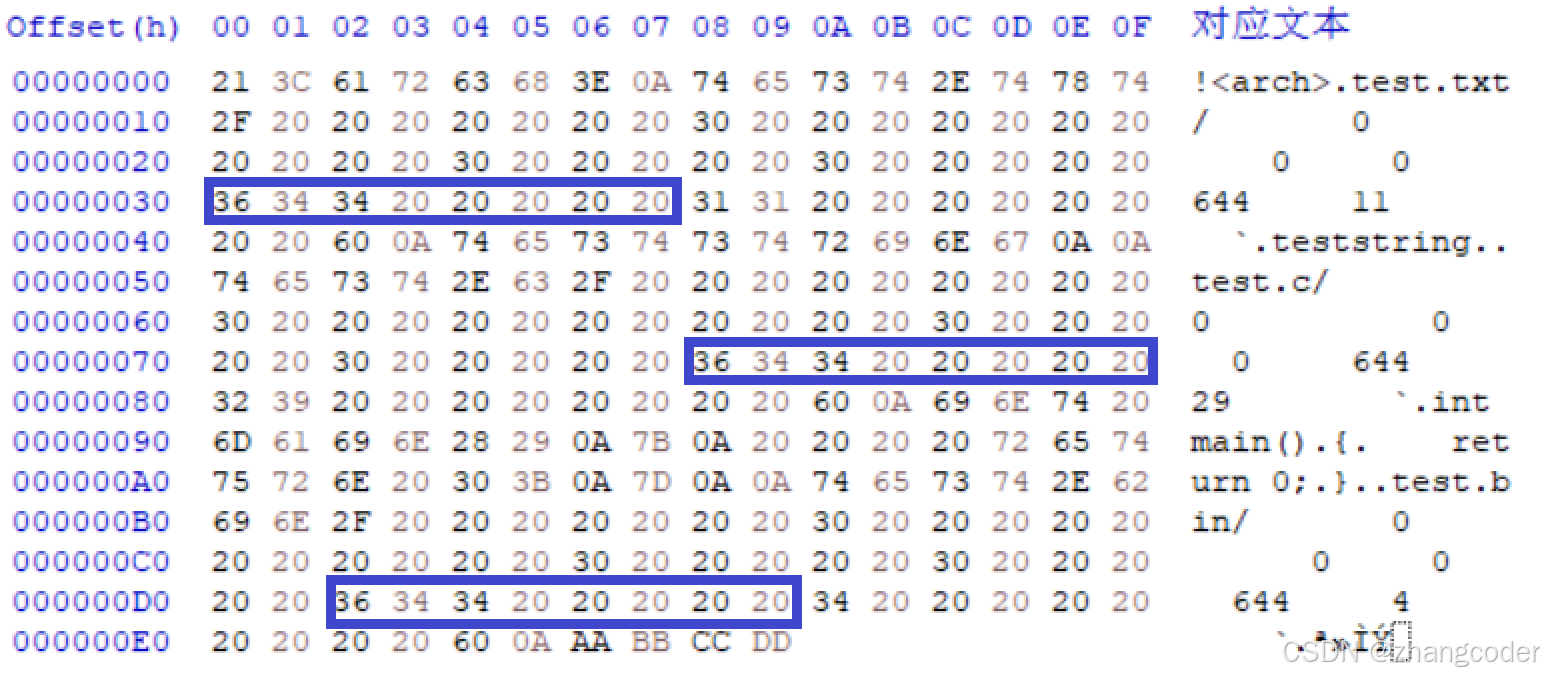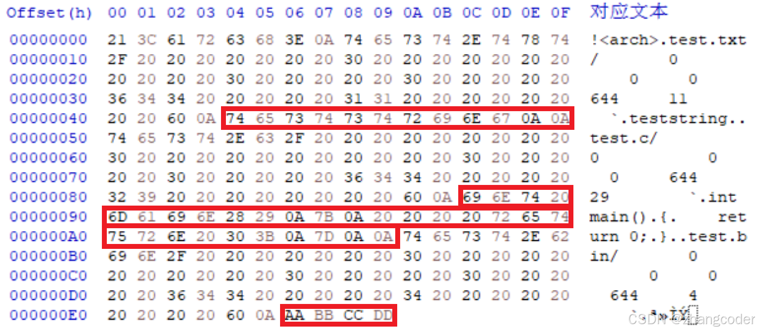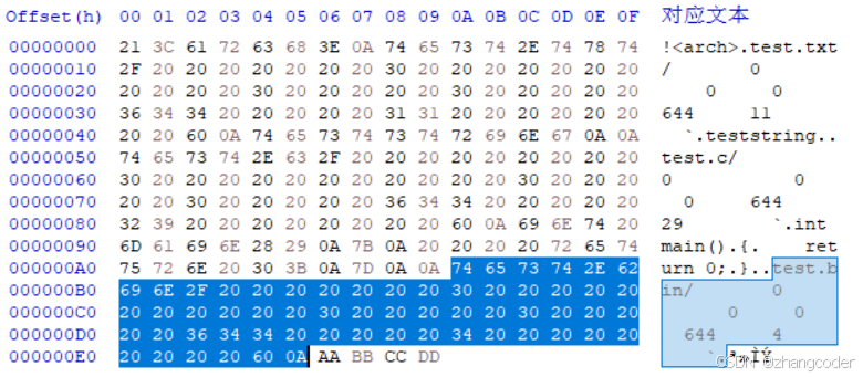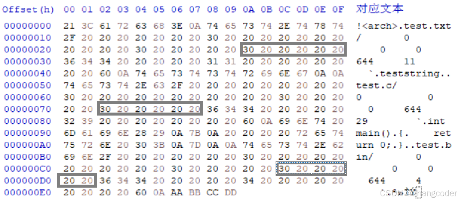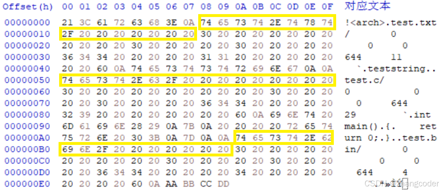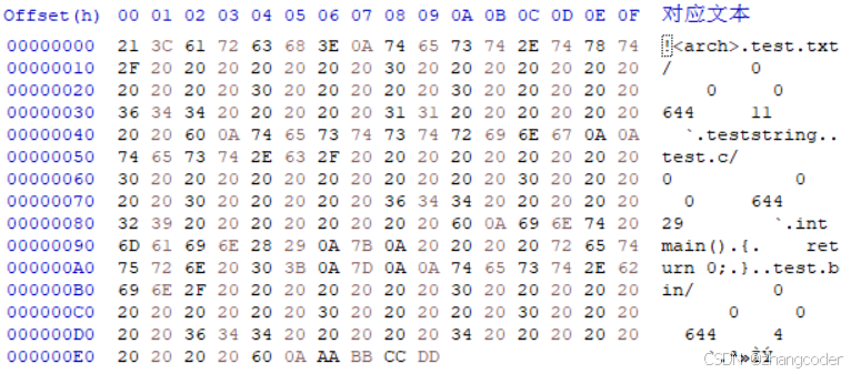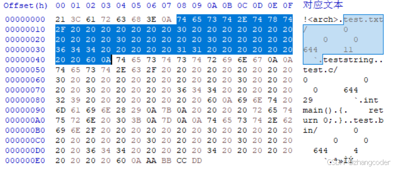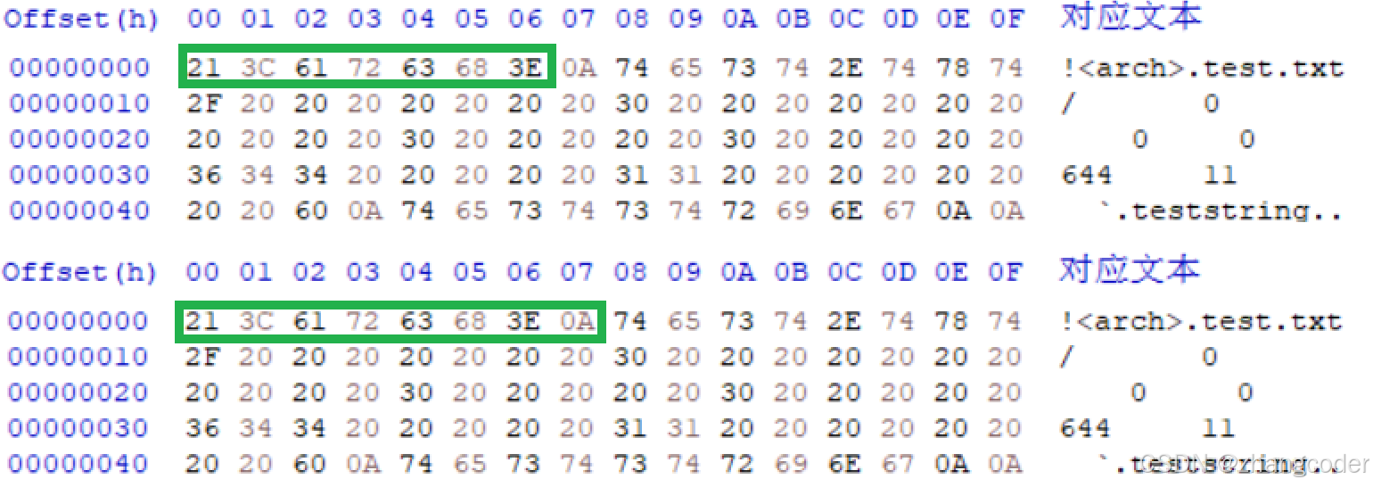 注意:所有数据按偶字节边界 对齐,即每个成员(归档文件头 + 归档文件内容)的起始偏移必须是2的倍数,因此某些情况下,文件内容的末尾会添加0x0A用于对齐,就像上图的那样