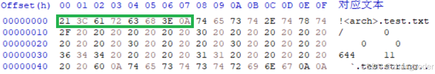 这个ARMAG是ARchive MAGic number(归档文件魔数)的缩写,其为"!<arch>\n",需要带上\n,而且\n的ASCII码为0x0A