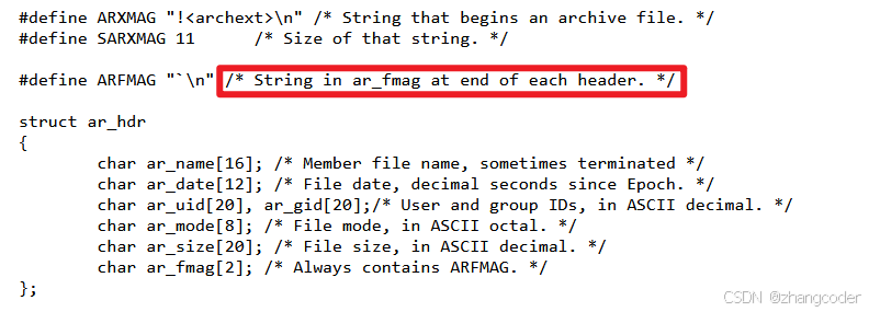 这个ar_fmag是每个归档文件头末尾必须要有的,在https://unix.org/whitepapers/ar-format.html网站中有说明:
