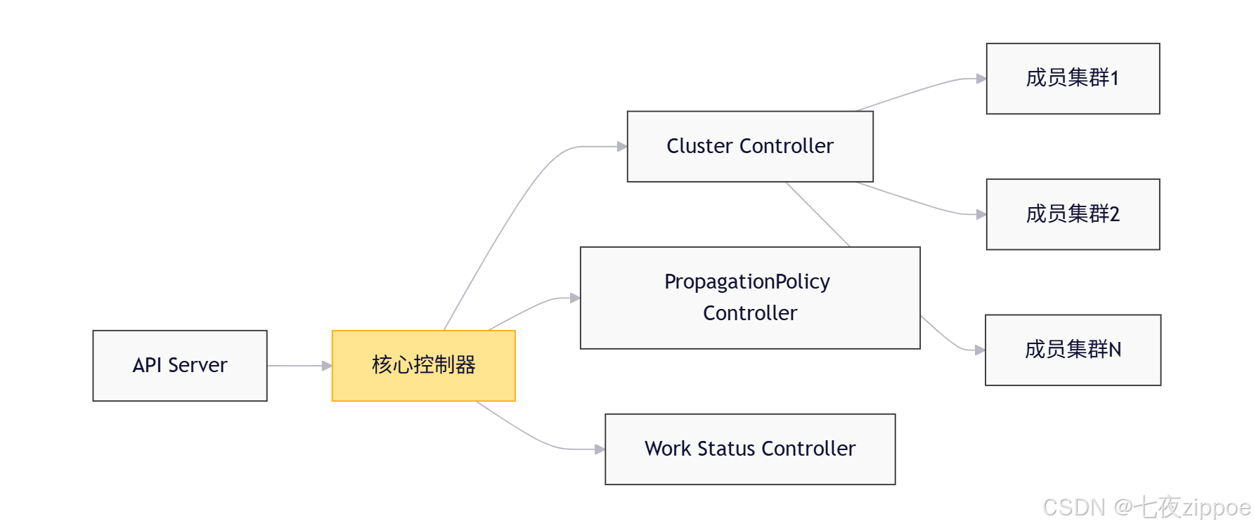 - PropagationPolicy Controller:实现资源分发策略的核心组件,支持副本拆分、集群亲和性等复杂策略