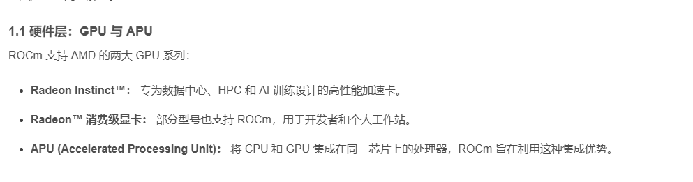 APU (Accelerated Processing Unit): 将 CPU 和 GPU 集成在同一芯片上的处理器,ROCm 旨在利用这种集成优势。