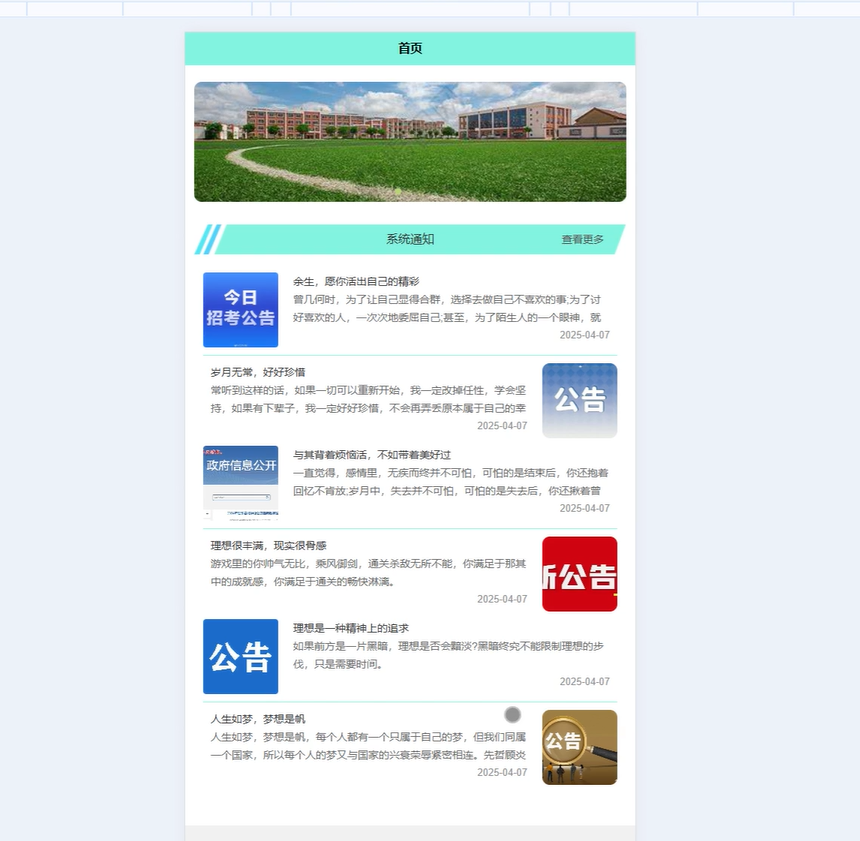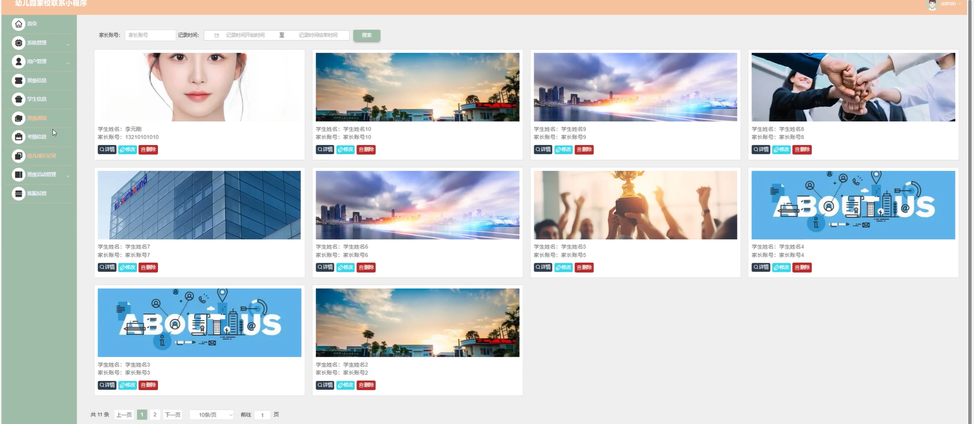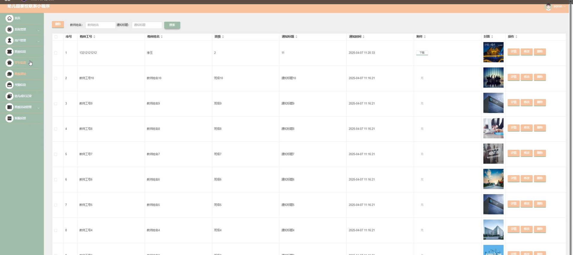 - 信息发布:发布通知(附图片、视频、文档),记录并上传学生学习生活状态、考勤档案;