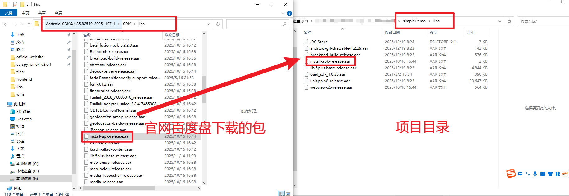 - 将下载下来的 SDK包中SDK\libs\ 目录下的 install-apk-release.aar 复制到 simpleDemo\libs 目录下, simpleDemo\build.gradle 中已自动自动扫描libs 目录, 故无需手动引入, 放进去即可