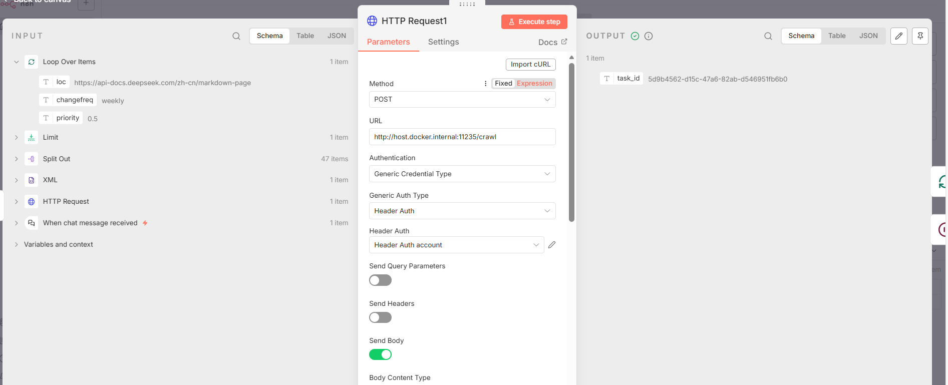 method: "POST"url:http://host.docker.internal:11235/crawlbodyParameters: 发送包含urls和priority(值为10)的请求体。authentication: 使用httpHeaderAuth进行认证。
