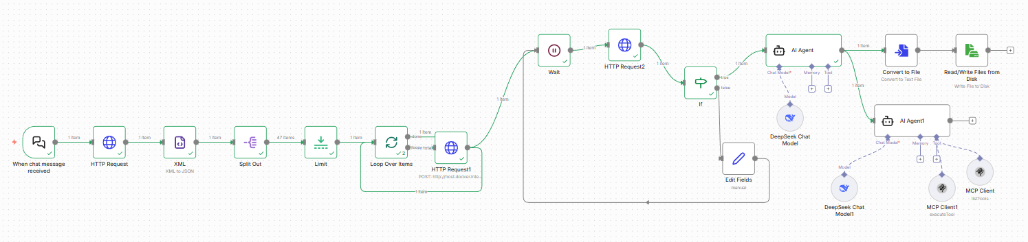 AI Agent输出的文本内容转换为文件对象。文件名由输出内容的第一行决定 ({``{ $json.output.split('\\n')[0] }}.md),以生成一个简洁且相关的文件名。 - 节点 2: Read/Write Files from Disk: 将上一步生成的文件对象实际写入到服务器的磁盘。值得注意的是,此节点的