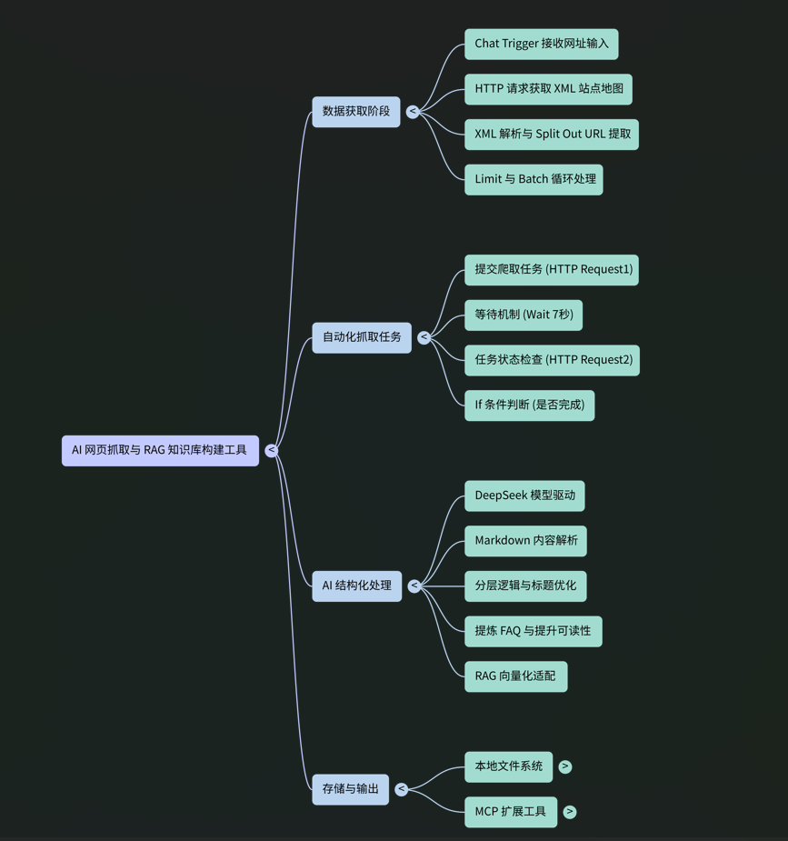 本文档旨在详细阐述一个名为"抓取网站信息"的自动化工作流的技术实现、架构和组件功能。该工作流的核心目标是从指定的网站站点地图(sitemap)出发,系统性地抓取网站内容,利用大型语言模型(LLM)对内容进行深度结构化处理,并最终生成适用于检索增强生成(RAG)知识库的标准化Markdown文件。