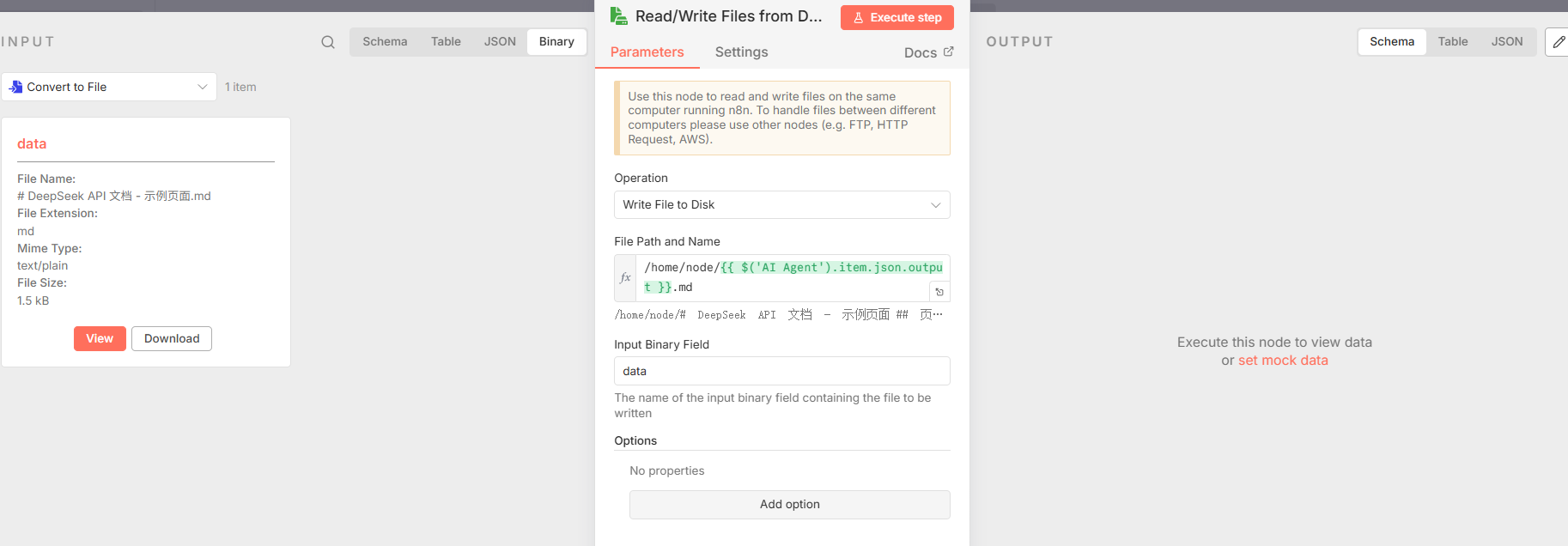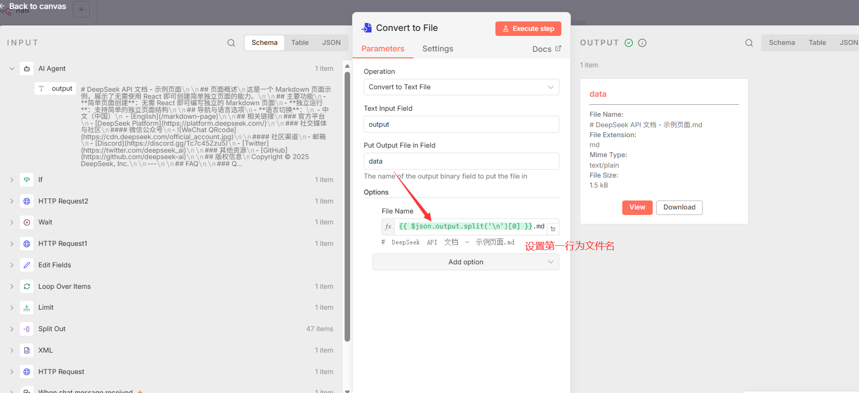 fileName参数配置为=/home/node/{``{ $('AI Agent').item.json.output }}.md,它会尝试使用AI Agent节点的全部文本输出作为文件名。