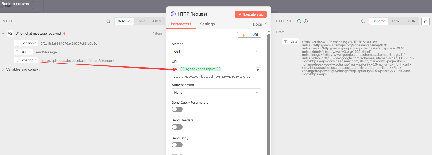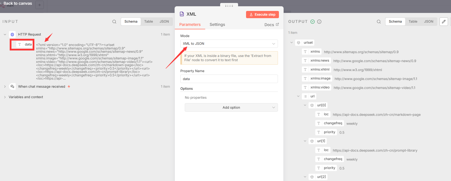 n8n-nodes-base.httpRequest - 核心功能: 向触发器提供的URL(站点地图的地址)发起GET请求,获取XML站点地图的原始数据。