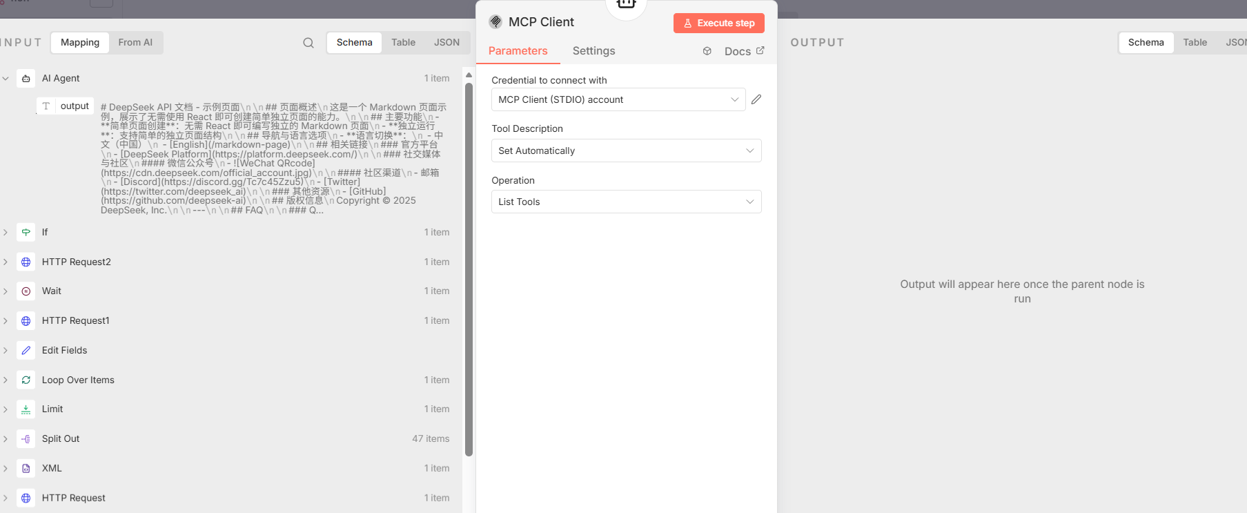 AI Agent1提供外部工具。此Agent连接了两个mcpClientTool节点。其中,MCP Client1被明确配置为执行executeTool操作,提供了一个名为write_file的工具,使Agent具备了执行文件写入的实际能力。