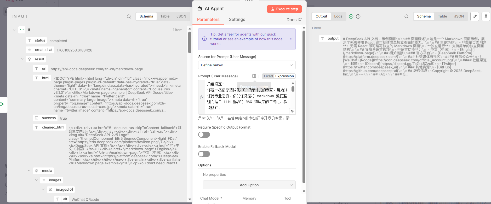- AI内容结构化 一旦内容抓取成功,工作流将调用大型语言模型(LLM),根据预设的指令对抓取到的原始Markdown内容进行格式化、清理和结构化处理。