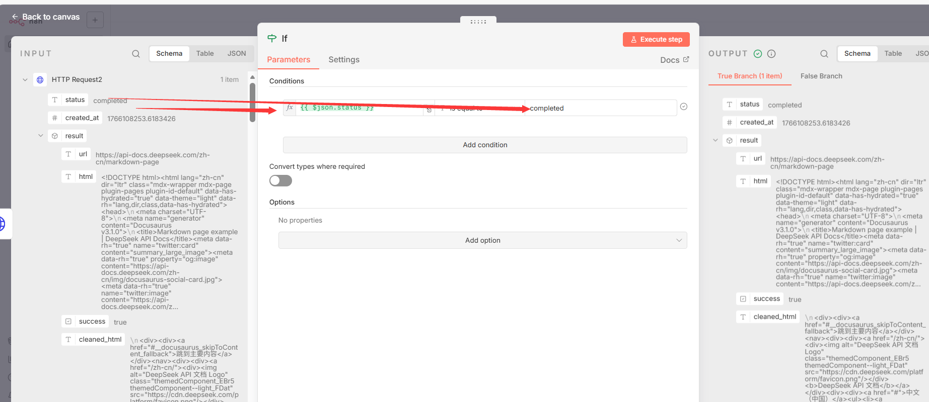 $json.status的值等于"completed",则流程进入数据处理分支;否则,进入轮询等待分支。