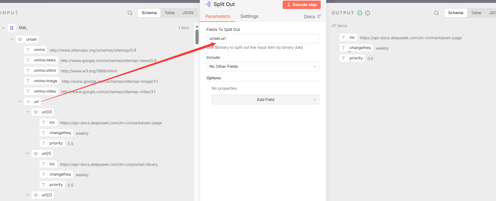 urlset.url字段下的所有URL条目拆分成独立的数据项,为后续的逐一处理做准备。 - 关键参数 :