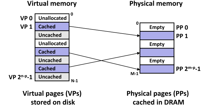 - 虚拟内存模型概念上,虚拟内存是存储在磁盘上的N字节连续数组。其内容被缓存在物理内存(DRAM)中,缓存块称为"页"(Page),大小通常为 P = 2 p P = 2^p P=2p 字节。