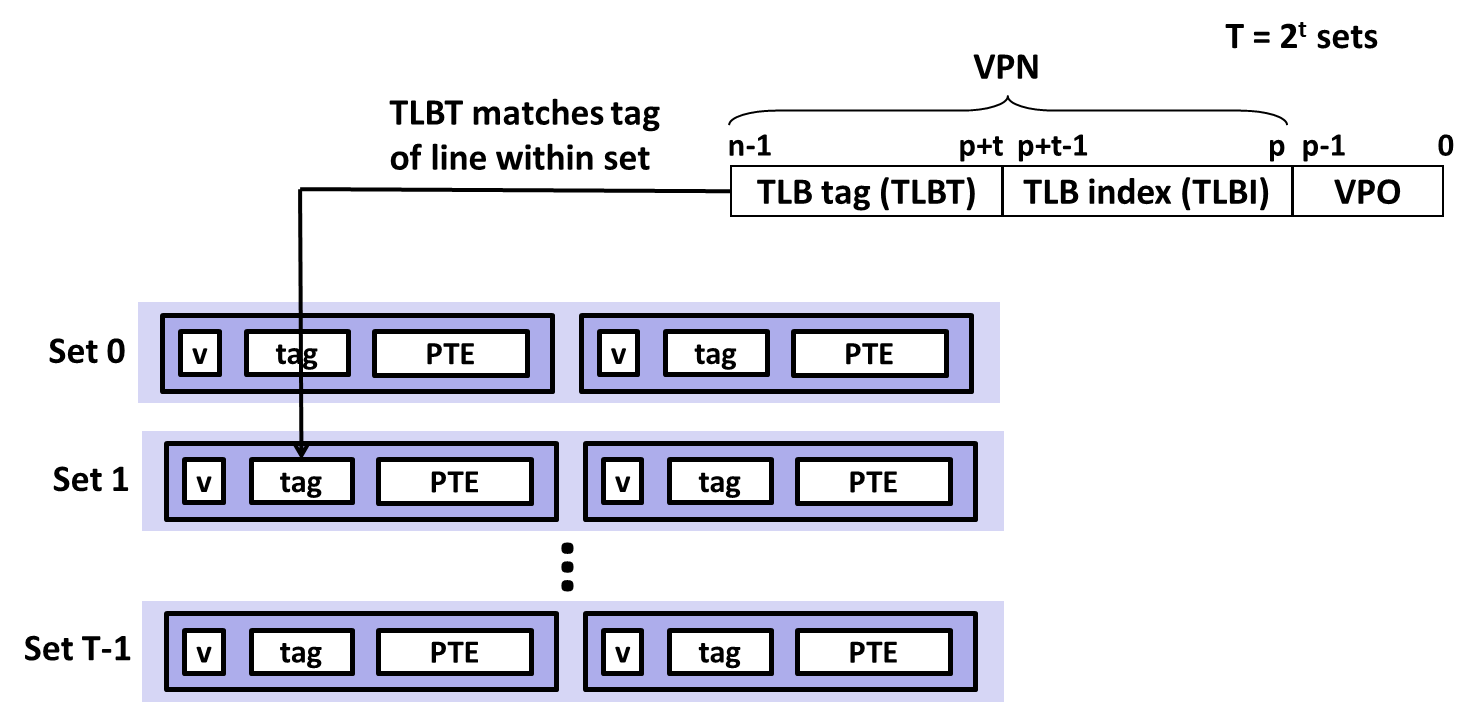 - 解决方案:利用 转换后备缓冲区(TLB)加速地址翻译。引入 TLB,MMU 内的小型组相联硬件缓存,直接缓存完整的页表项(PTE),实现快速虚拟页号到物理页号的映射。