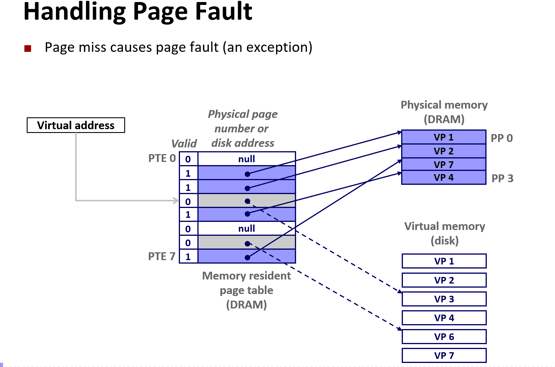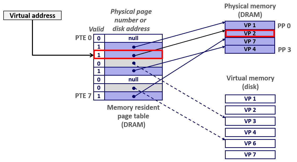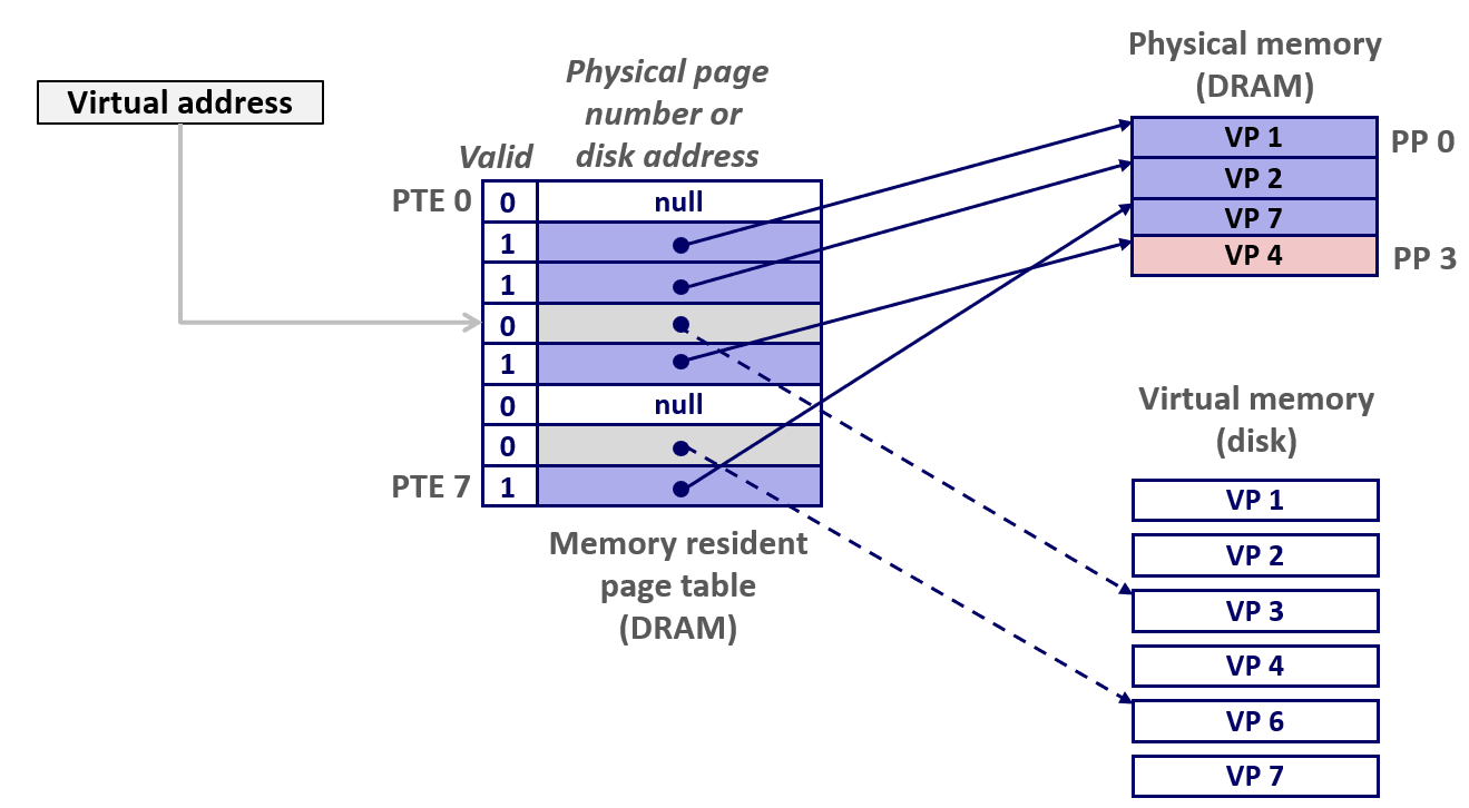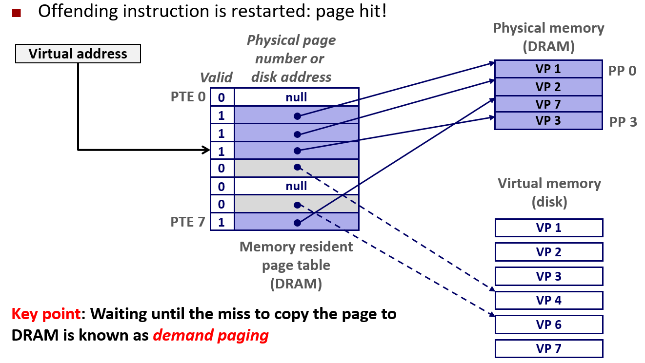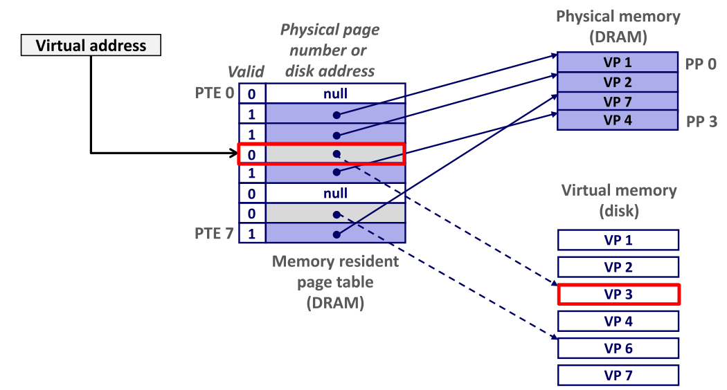 - 页面置换:将目标虚拟页(如VP 3)从磁盘调入空闲物理页,更新页表项(PTE)使其指向新的物理页,设置有效位。