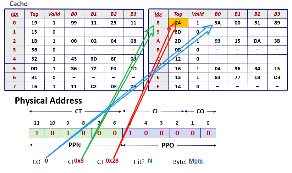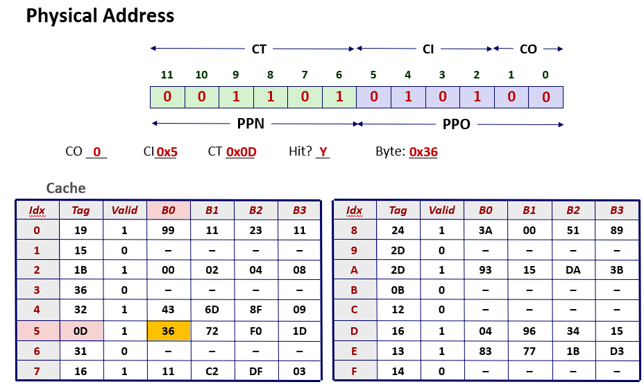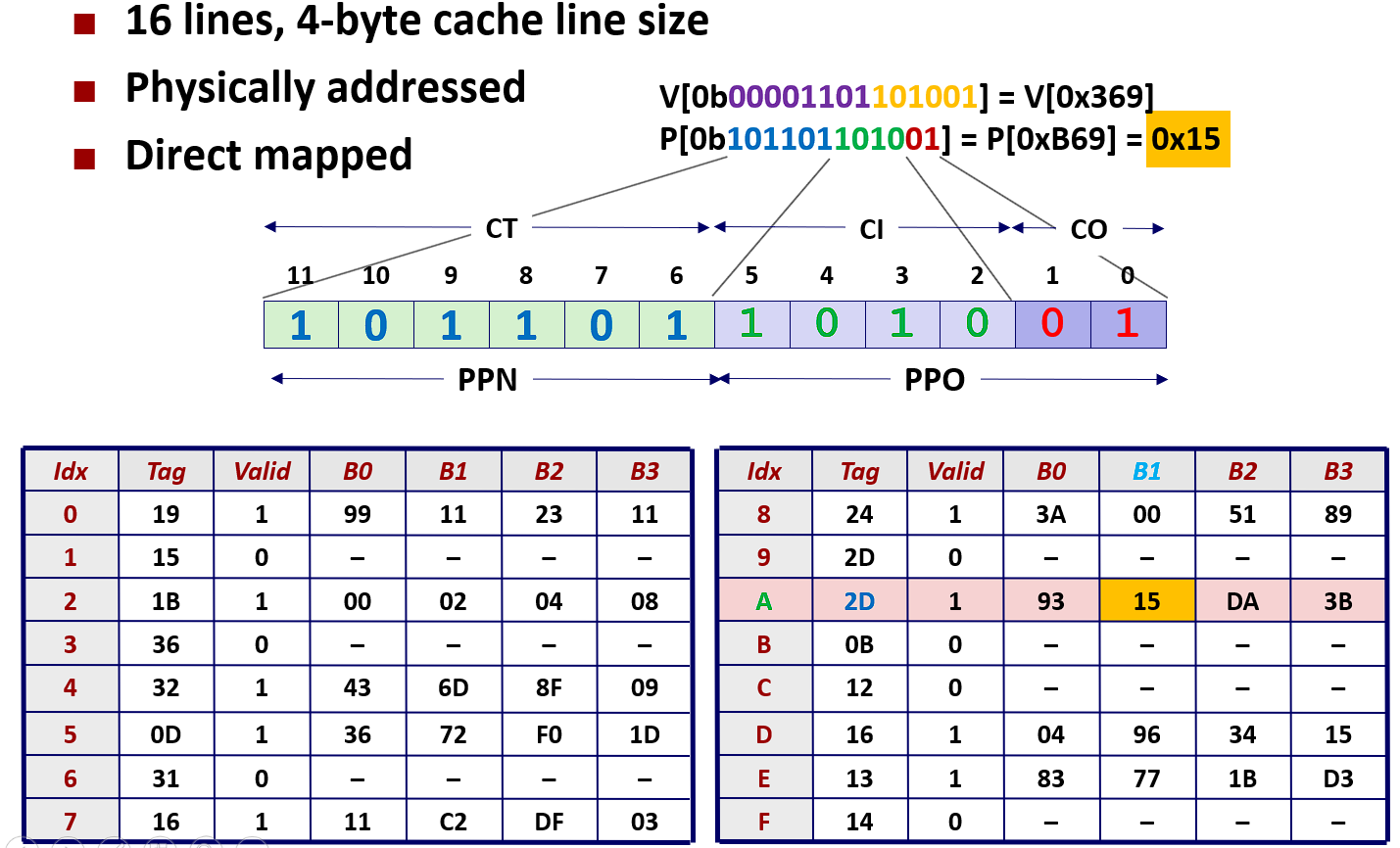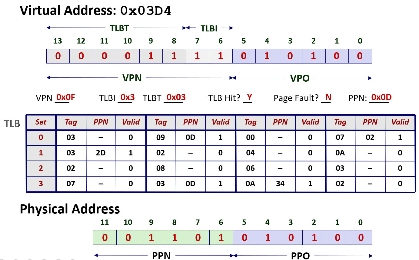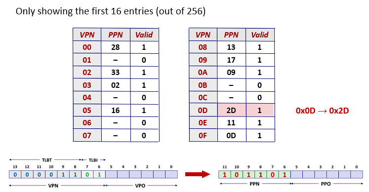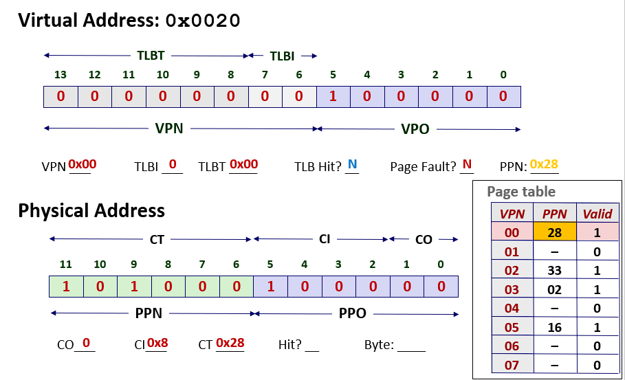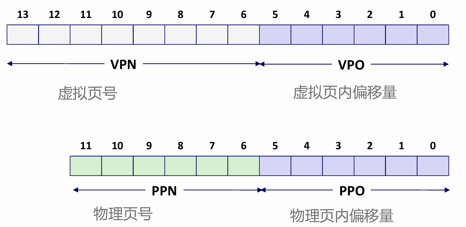 - 虚拟地址划分:高8位为VPN(虚拟页号),低6位为VPO(虚拟页内偏移)。