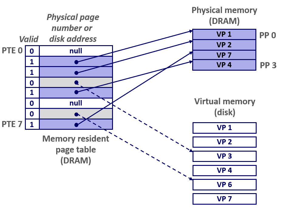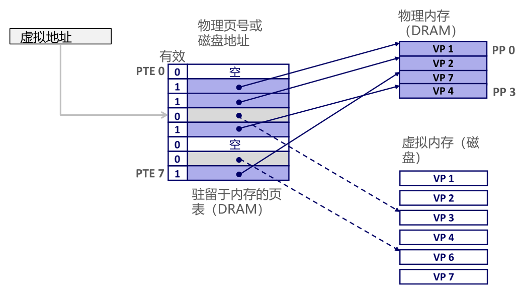 - 页表功能,由页表项(PTE)组成的数组,用于映射虚拟页到物理页。属于每个进程的内核数据结构,驻留在DRAM中。