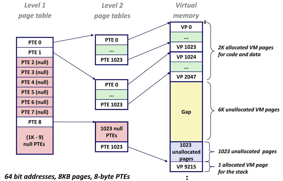 - 第一级页表:每个 PTE 指向一个第二级页表(常驻内存)