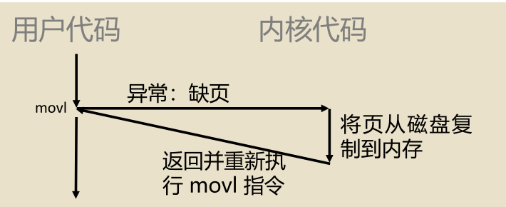 - 完成缺页处理,返回用户态:页面错误处理程序执行中断返回指令(iret),类似于ret指令,同时恢复特权级别,控制权交还给引发故障的指令,再次执行时不再发生缺页。