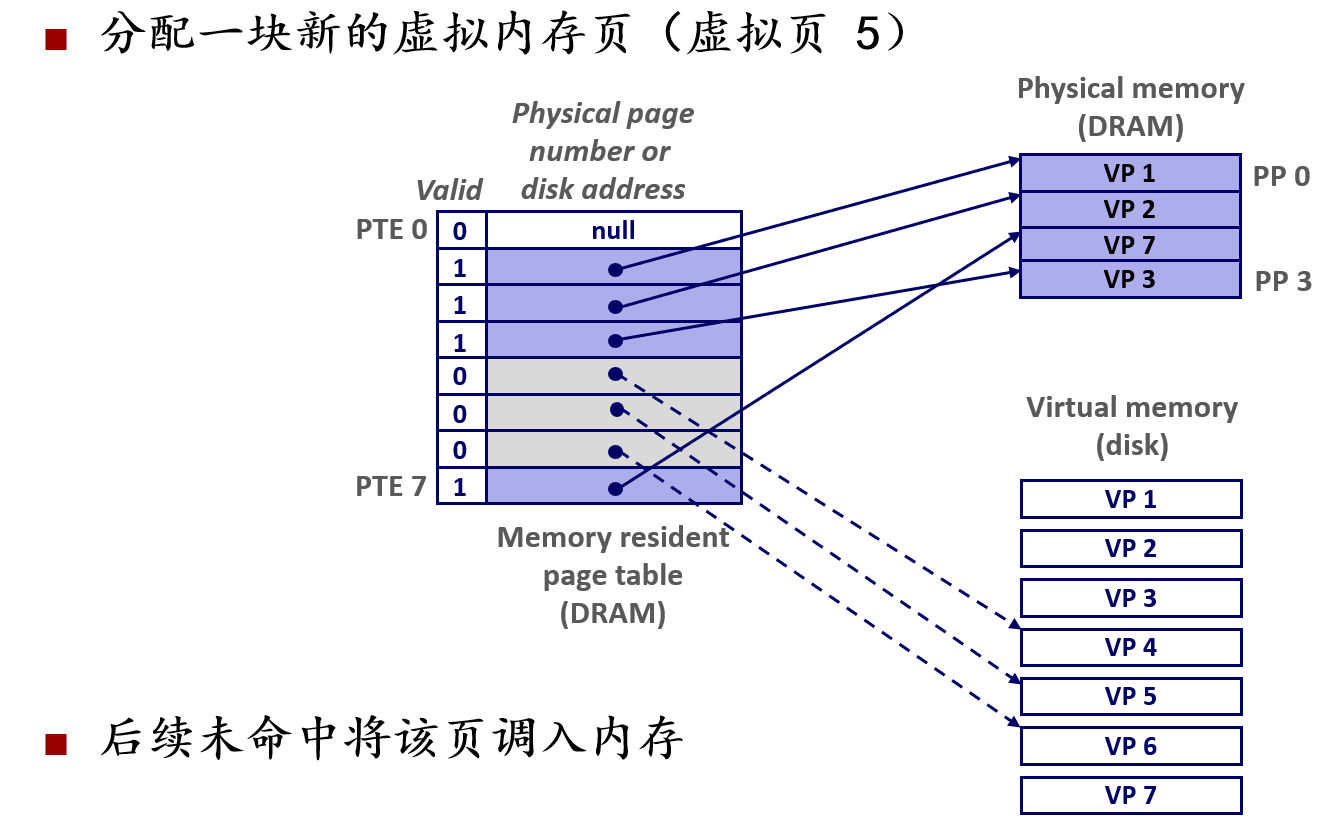 - 新页面分配:为虚拟内存分配一个新的虚拟页(如VP 5),在页表中创建对应PTE,初始标记为无效,后续访问将触发缺页,从而将其加载进内存。