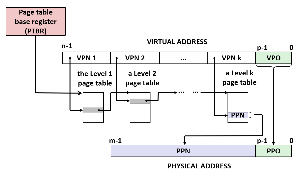 - 虚拟地址划分为 VPO 和多个层级的 VPN(VPN₁ 到 VPNₖ)