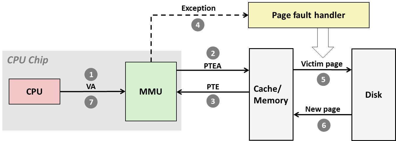 - 缺页异常:对尚未加载到物理内存中的虚拟内存字的引用(即DRAM缓存未命中)。
