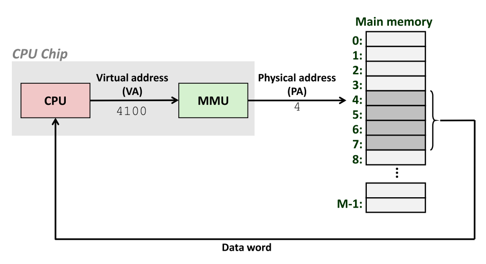 - 虚拟寻址系统系统结构:CPU生成虚拟地址(VA),内存管理单元(MMU)将其转换为物理地址(PA),主存存储实际数据。