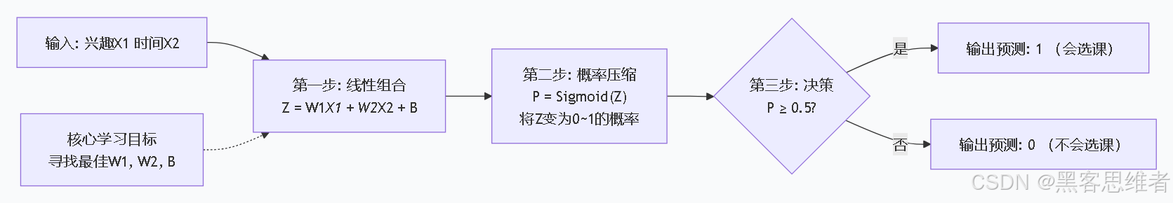 一开始,导师你给的权重(W₁=3, W₂=1, B=-2)可能是瞎猜的。那怎么找到最准的权重呢?逻辑回归通过学习历史数据来优化。