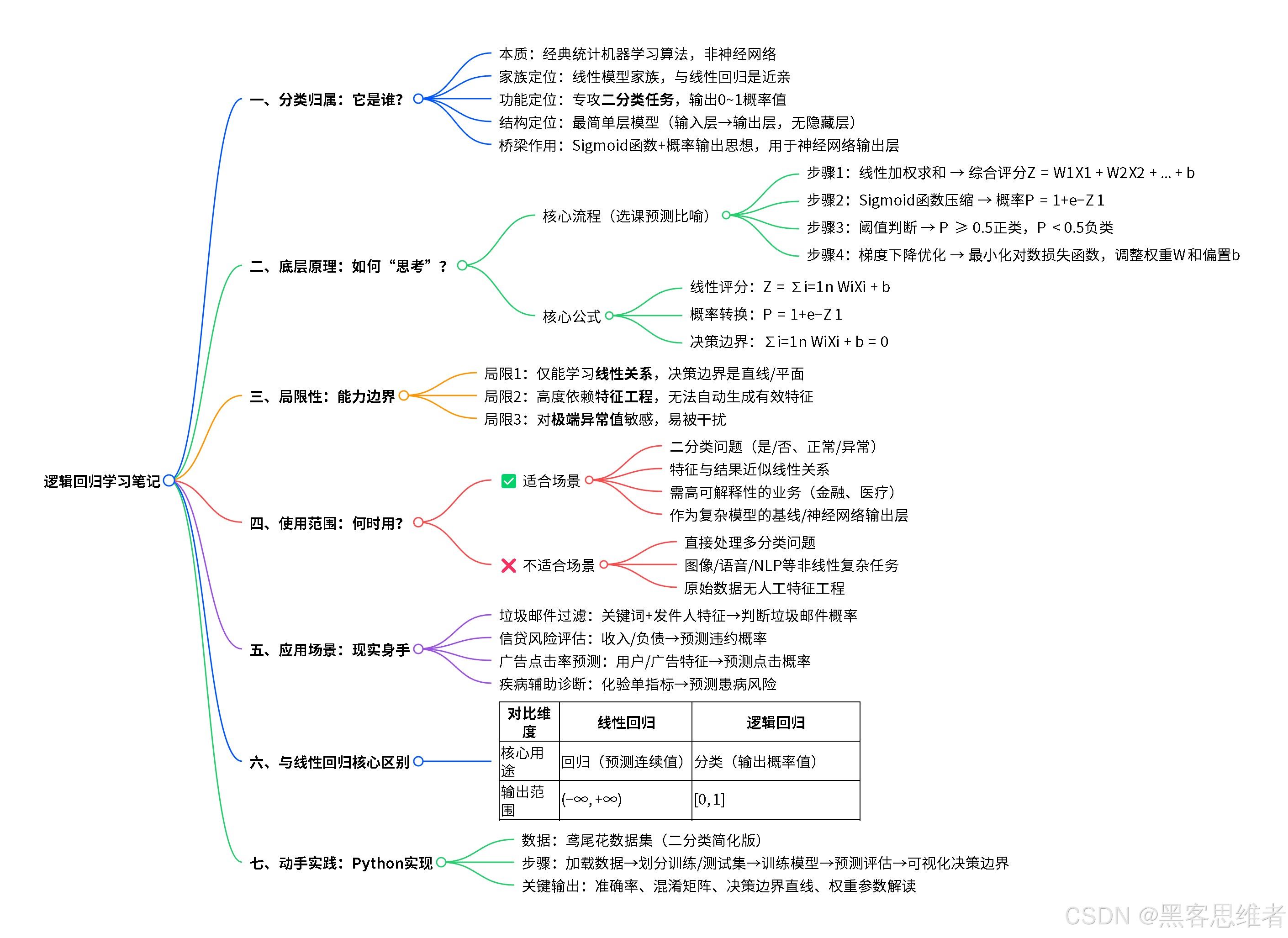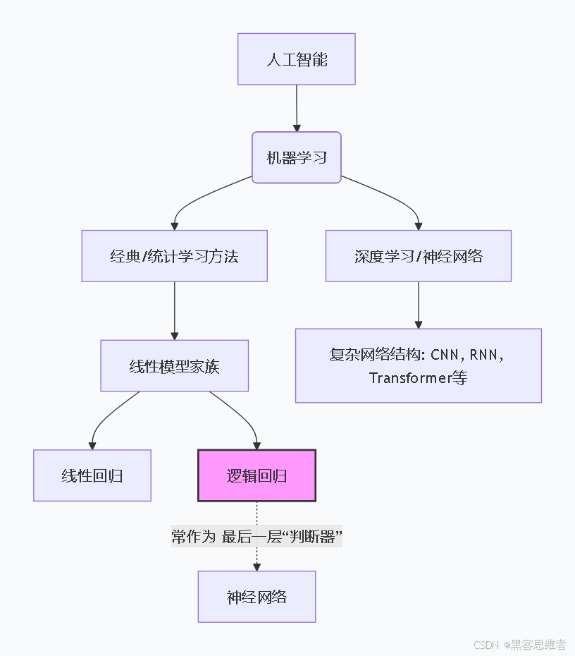 - 从家族看 :逻辑回归属于机器学习 领域下的经典统计学习方法 ,与线性回归是"近亲",都出自线性模型家族 。它比深度神经网络(如CNN、RNN)更早被提出,结构也简单得多。