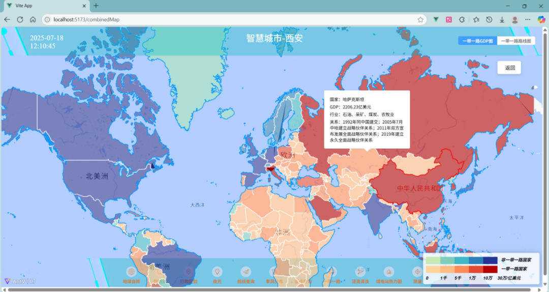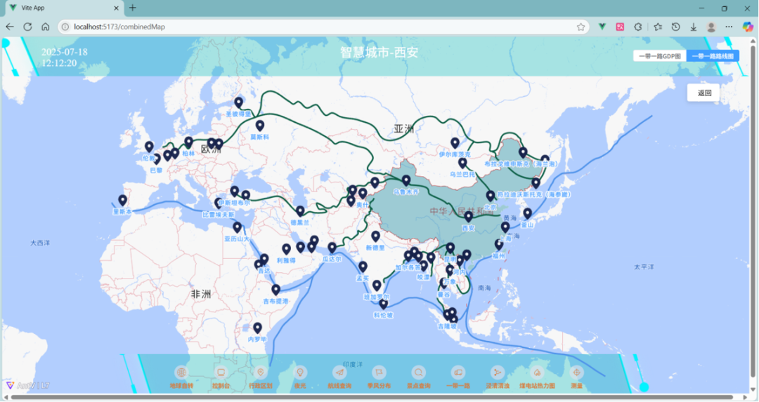然而,当前西安在城市治理中仍面临一些挑战,如区域管理精细化不足、国际合作数据可视化薄弱等问题。同时,"一带一路"沿线国家的经济联动、资源流动缺乏直观的数字化展示工具。为了解决这些问题,本项目以"智慧城市西安与一带一路"为主题,融合地理信息技术与多源数据,构建集城市管理与国际合作展示于一体的可视化系统,助力西安智慧化治理及"一带一路"合作的直观呈现。